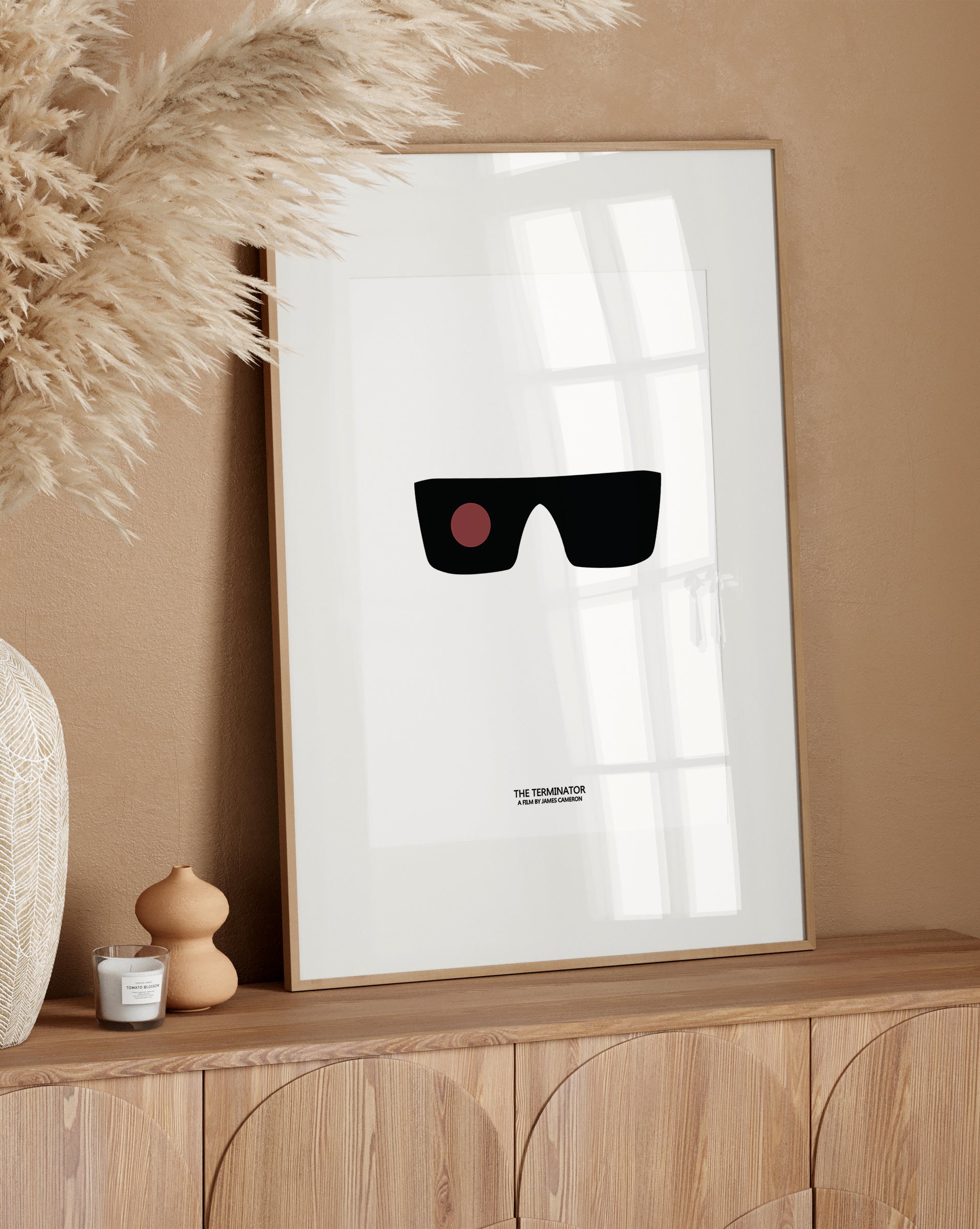Minimalism meets cinematic legend in this striking The Terminator poster. Featuring the iconic black shades with a single red eye peeking through, this artwork pays homage to one of the most unforgettable sci-fi characters in film history. Deceptively simple, the design captures the essence of the Terminator—cool, calculated, and utterly iconic—with just a few bold shapes.