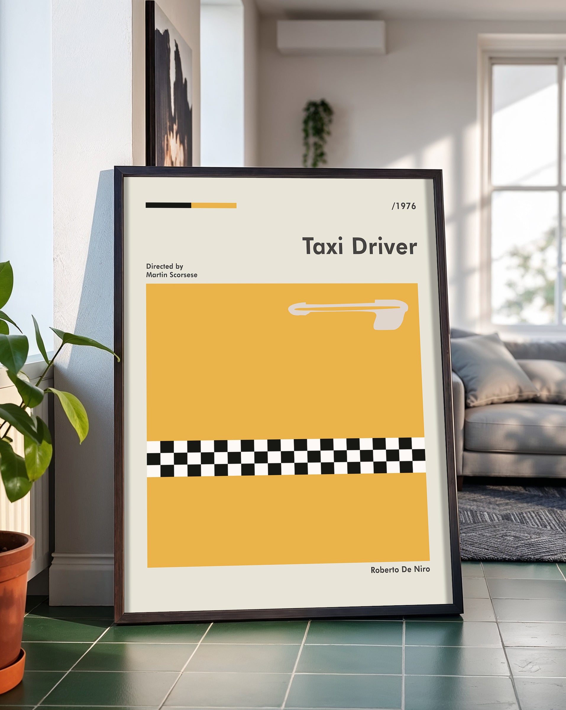 This minimalist "Taxi Driver" poster captures the raw essence of Martin Scorsese’s iconic 1976 film starring Robert De Niro. With its bold use of taxi yellow and a classic black-and-white checker stripe, it instantly evokes the gritty streets of New York City and the psychological tension of the movie. A sleek white gun silhouette quietly nods to the film's undercurrent of violence, while the restrained typography mirrors the clean aesthetic of vintage film posters.