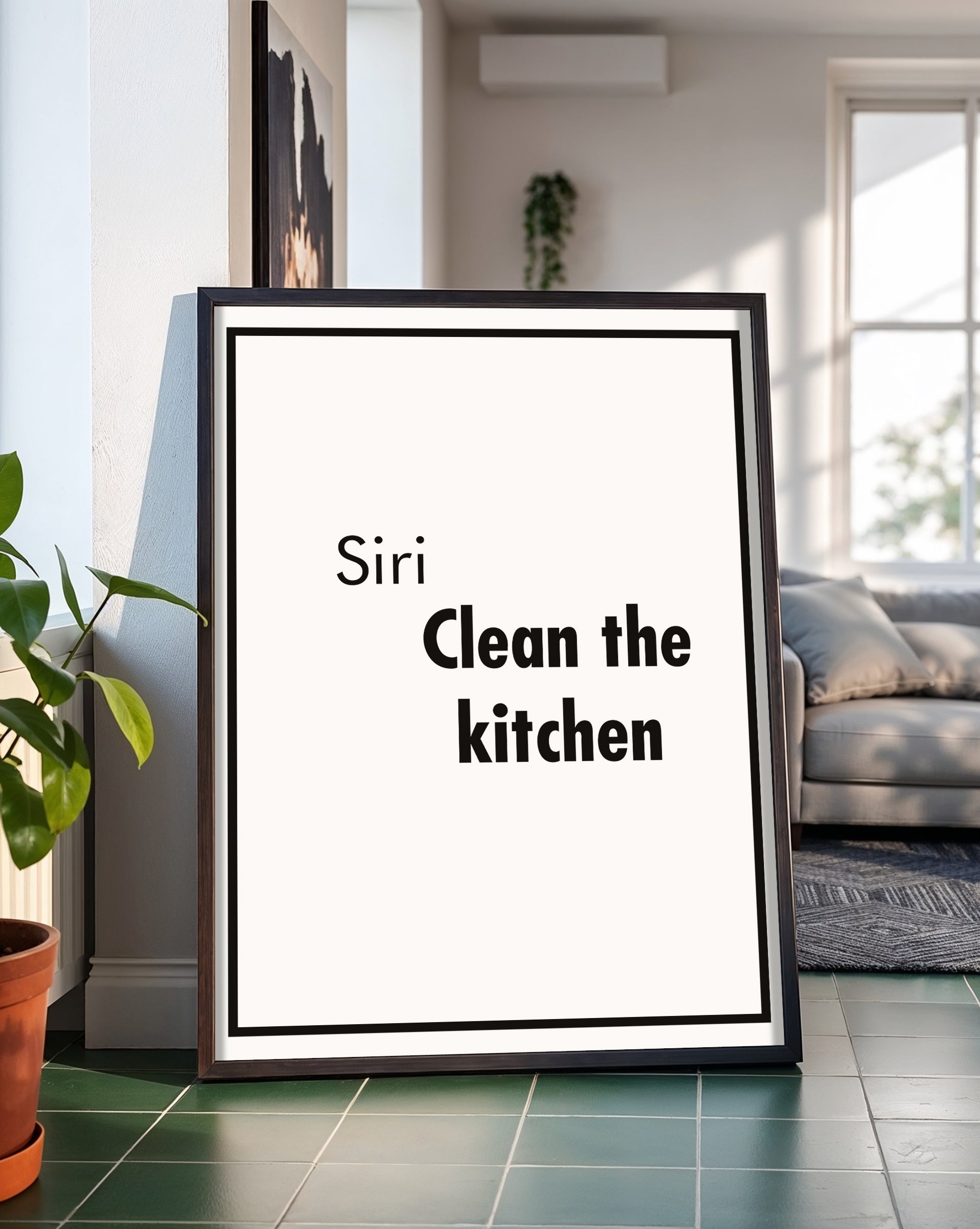 Add a dose of humor to your home with this bold and witty print. Featuring the phrase “Siri, Clean the Kitchen” in a minimalist black font on a crisp white background, this artwork delivers tech-savvy sarcasm with clean, contemporary style. It’s perfect for kitchens, dining areas, smart homes, or anywhere you could use a little laugh while doing chores.