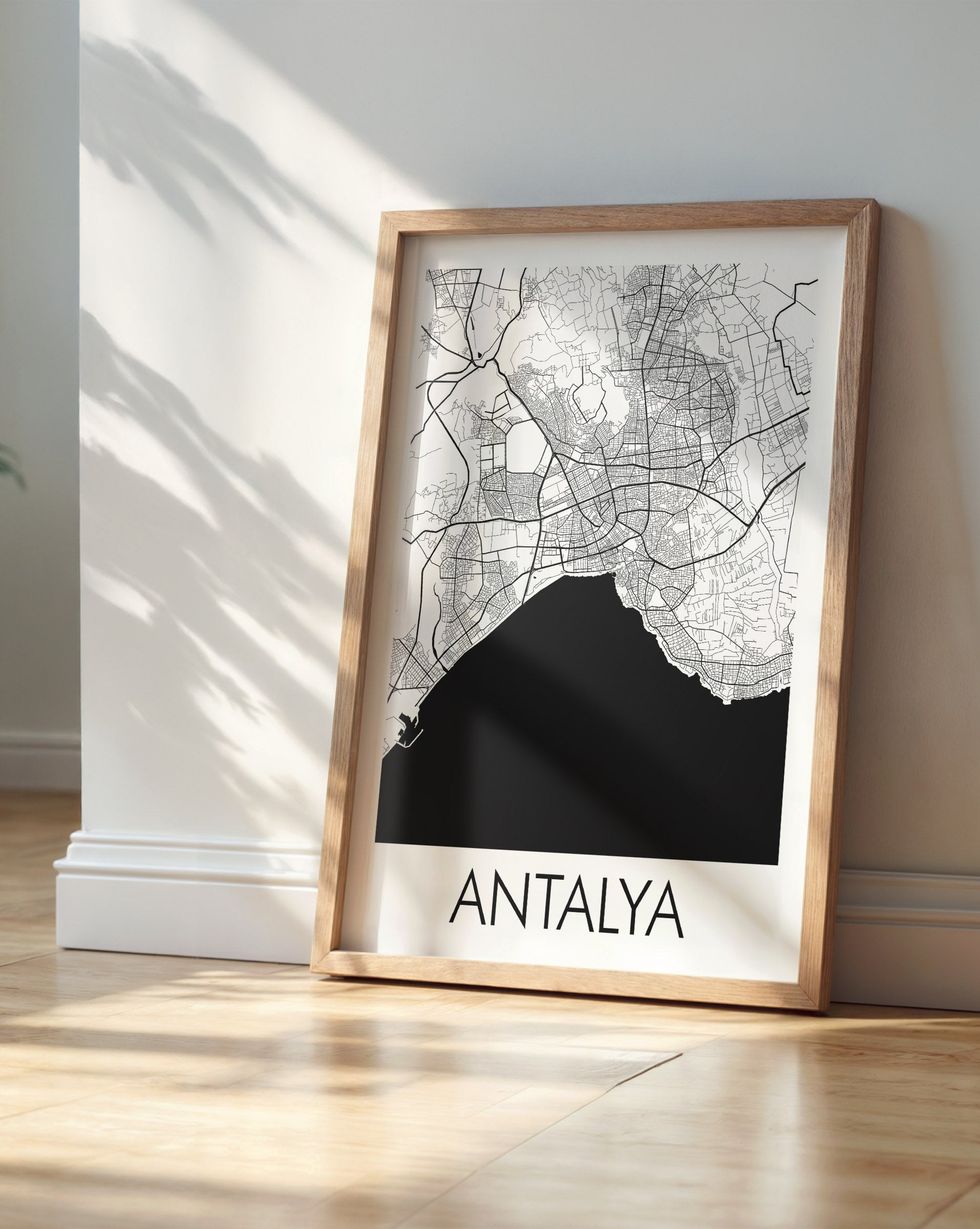 Celebrate the beauty of the Turkish Riviera with this elegant Antalya Map art print. Featuring a detailed street layout in crisp black and white, the poster highlights Antalya’s stunning coastal silhouette and intricate city design. With the sweeping curve of the Mediterranean Sea boldly filling the bottom half, this print brings a sense of calm, clarity, and wanderlust to any space.