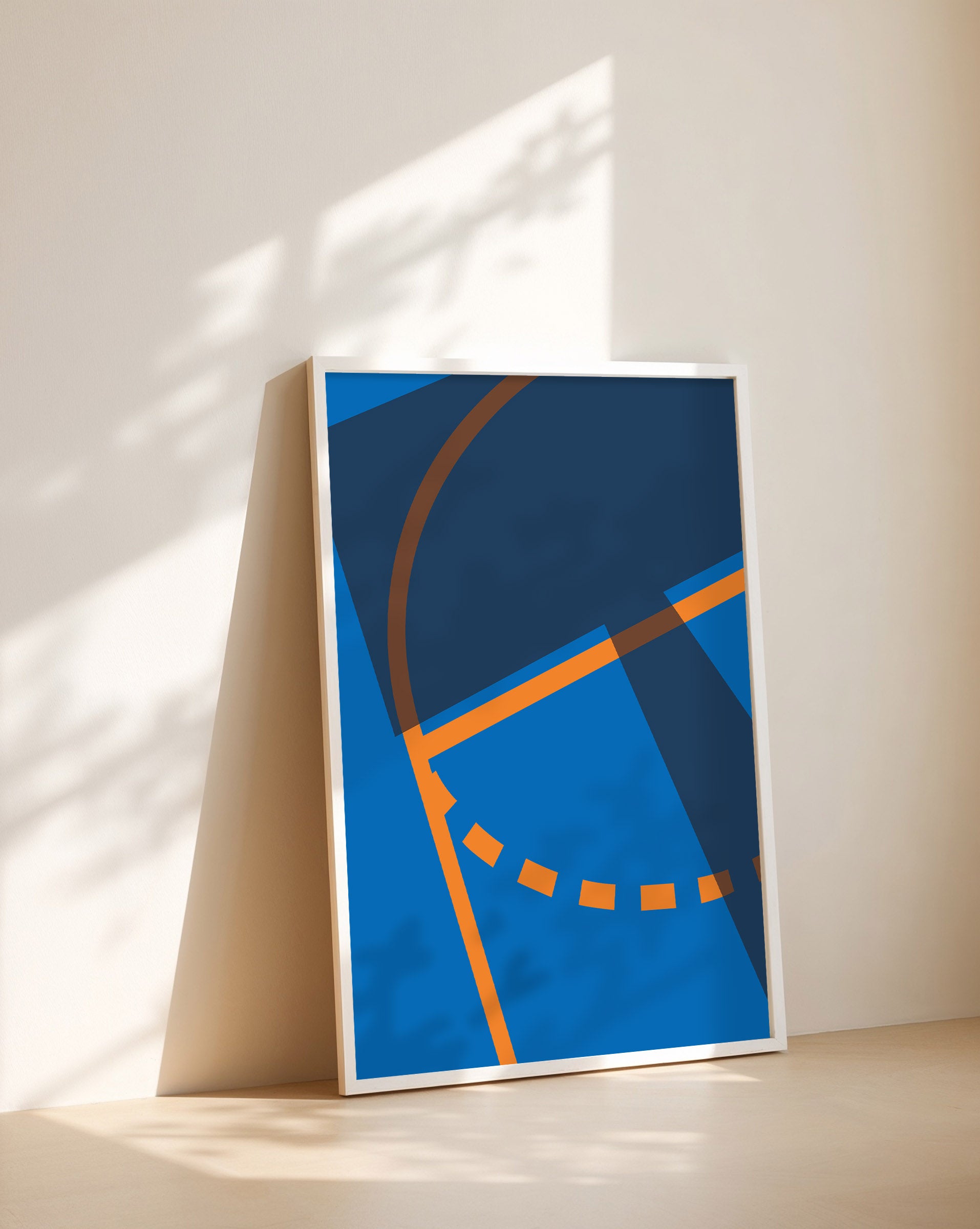 Infuse your space with bold energy and modern sport-inspired style with Sunset Court, a striking basketball art print that reimagines the court with clean lines and vivid contrast. Featuring a rich blue background accented by burnt orange court markings, this poster captures the elegance and structure of the game in a sleek, minimal form. It’s a perfect fusion of athleticism and art — ideal for fans of basketball, design, or both.