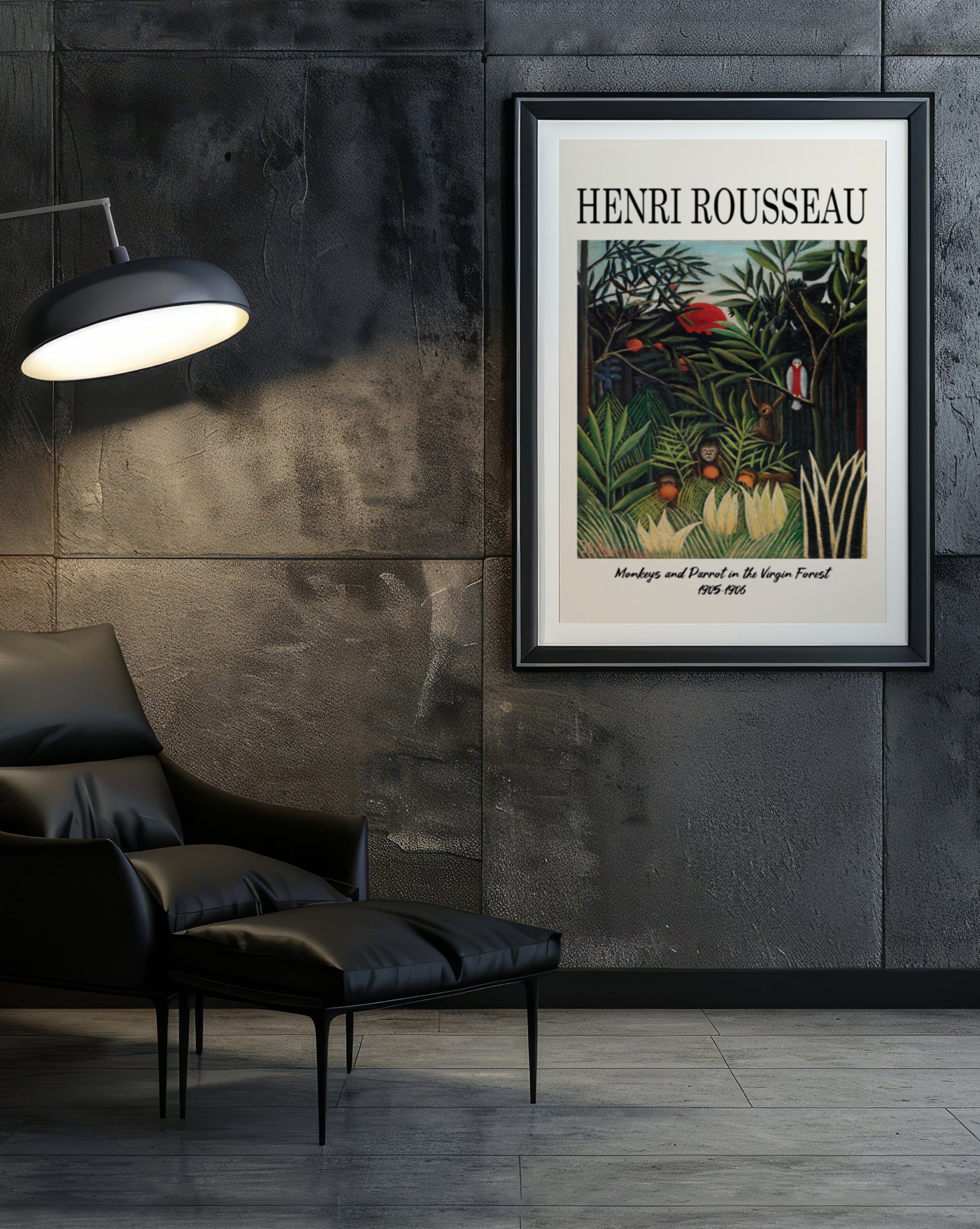 Bring the allure of the untamed jungle into your home with this striking art print of Monkeys and Parrot in the Virgin Forest by Henri Rousseau. Painted in his signature naïve style, this composition is brimming with life and mystery—featuring lush foliage, curious monkeys, and vibrant parrots deep within an imagined tropical forest. A conversation starter and visual delight, this piece radiates a surreal calm and playful energy. Ideal for modern interiors that seek a touch of the wild, or for art lovers who appreciate post-impressionist charm.