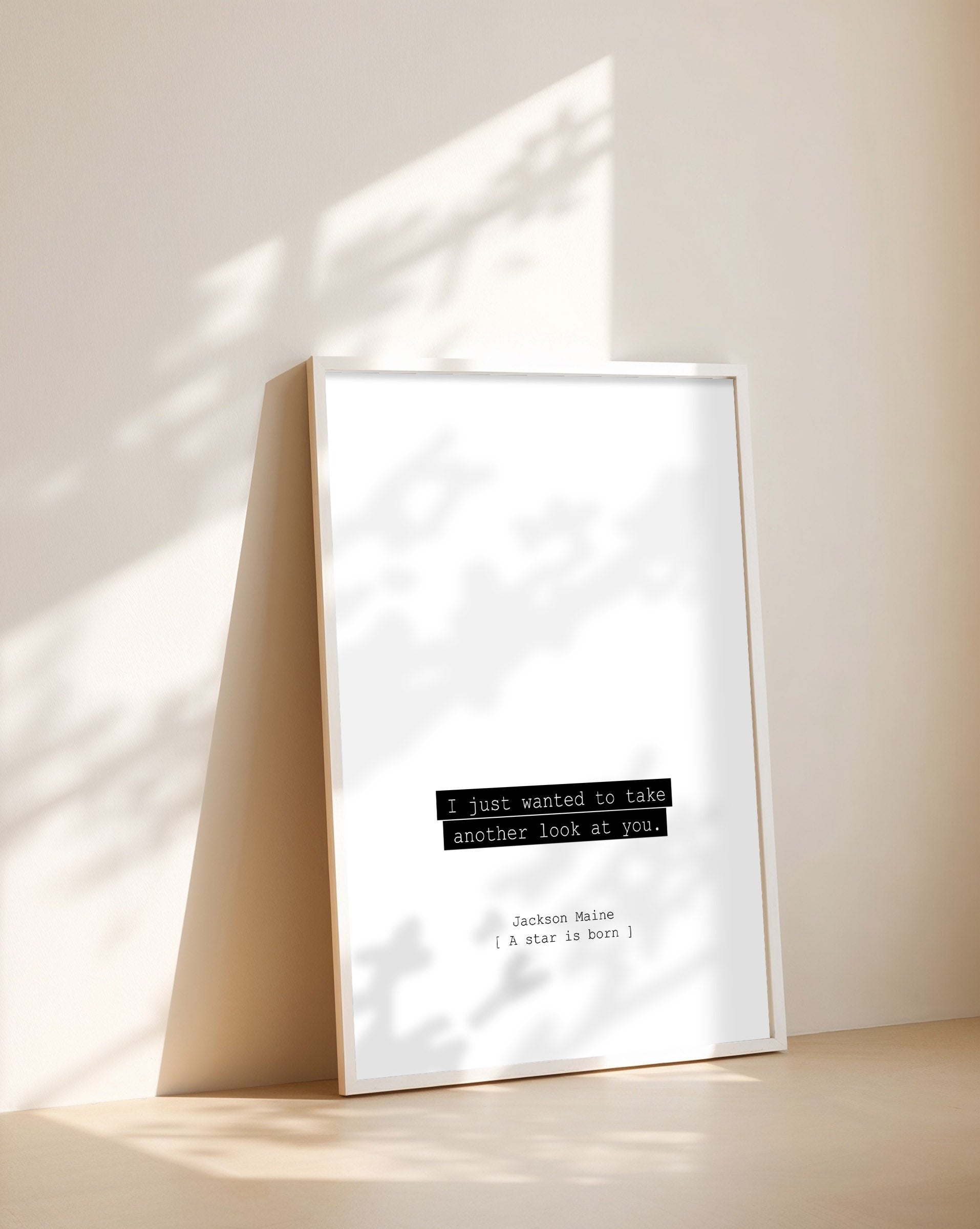 Capture one of the most iconic and heartfelt lines in modern cinema with this minimalist Jackson Maine Quote Poster from A Star Is Born. Featuring the unforgettable line, “I just wanted to take another look at you,” this print speaks volumes with subtle design and emotional impact. Ideal for movie lovers, romantics, or anyone who appreciates the beauty of understated words. With a clean white background and bold typewriter-inspired font, this print is perfect for bedrooms, reading nooks, or as a thoughtful gift.