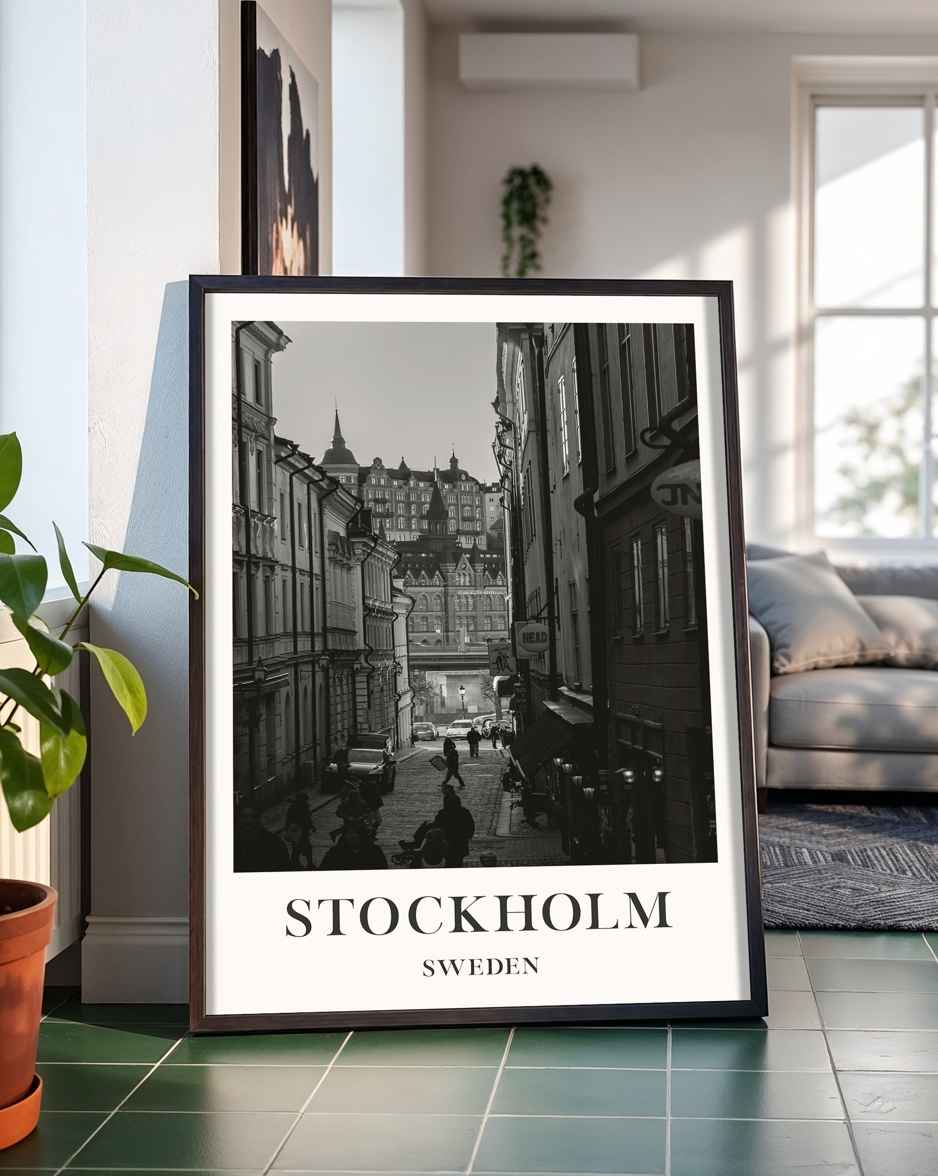 The monochrome aesthetic offers a refined and classic vibe that suits any interior, from modern apartments to cozy reading nooks. Whether you’ve wandered these cobbled alleys yourself or dream of visiting one day, this print brings Stockholm’s beauty home.