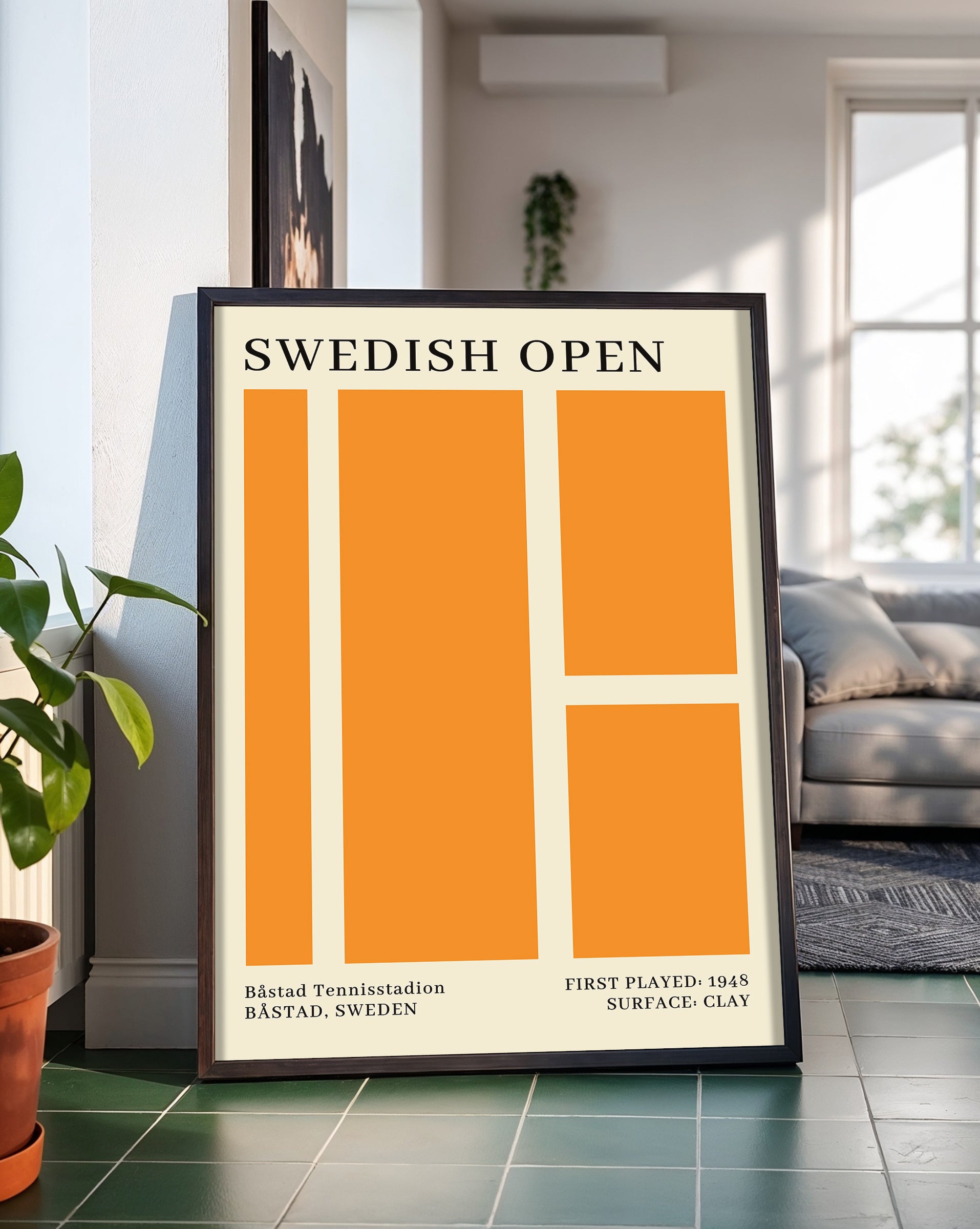 This minimalist "Swedish Open" poster pays tribute to one of Sweden's most beloved sporting events — the tennis tournament held in Båstad. With a striking, geometric design that echoes the clean layout of a clay tennis court, the print features bold orange panels symbolizing the distinctive surface of the venue, known for its rich history and picturesque seaside location.