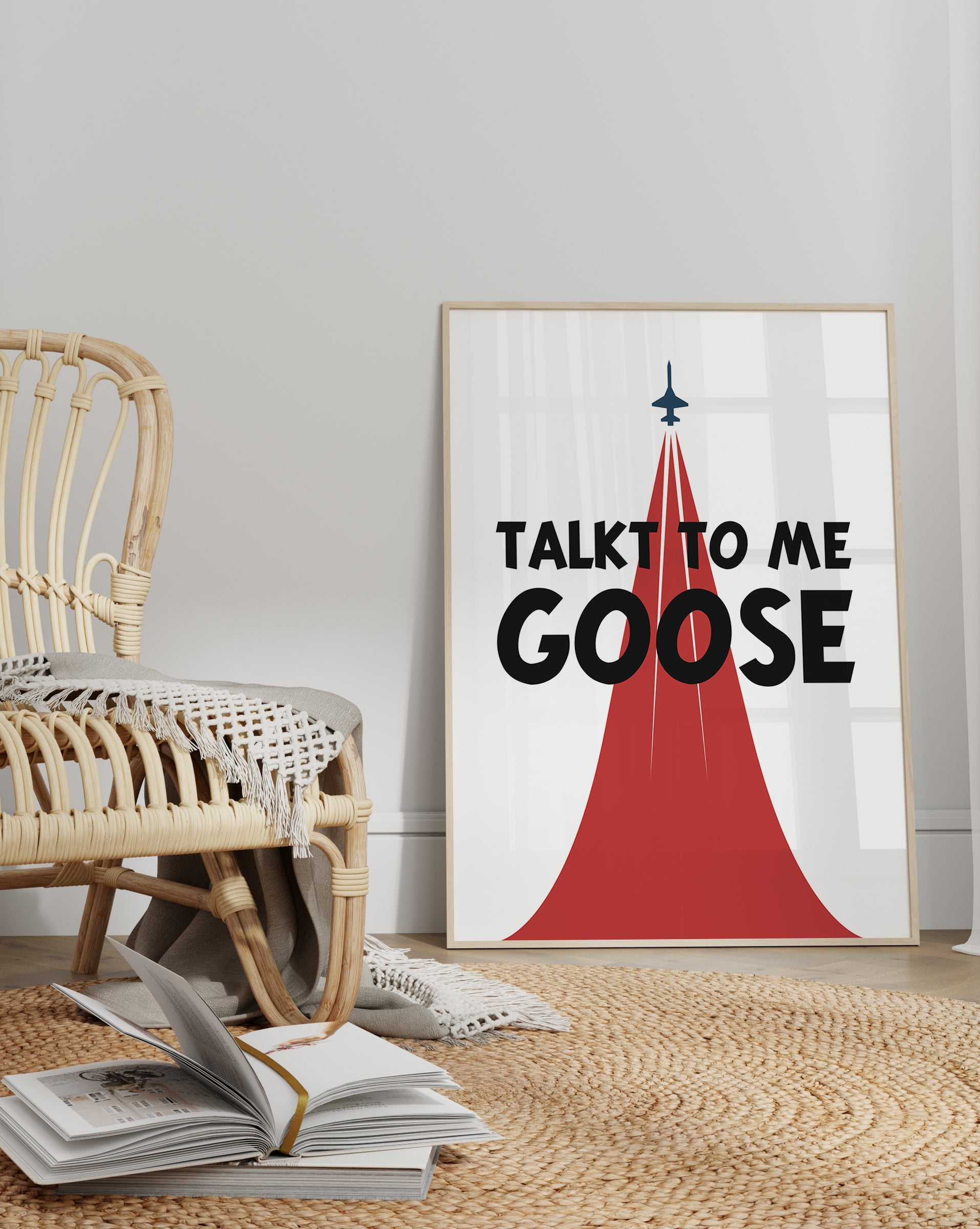 This bold and nostalgic "Talk to Me Goose" poster pays homage to one of the most iconic lines from the cult classic Top Gun. Featuring a minimalist jet design soaring upward, leaving behind a vivid red trail that draws the eye straight to the powerful typography, this print combines retro aviation aesthetics with modern design. The quote is a reminder of the camaraderie and emotional tension between Maverick and Goose, making it a must-have for fans of the film.